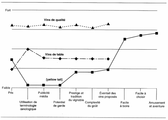 L’exemple du vin [Yellow tail] montre qu’en supprimant toutes références à l’oenologie, en faisant un vin simple et facile à boire, il est possible de sortir du marché traditionnel sur vin pour aller sur celui des boissons agréables à boire.