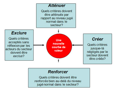 Lorsque l’on élabore un canevas stratégique on doit réfléchir dans quatre directions de manière à toujours plus se différencier. La matrice exclure–atténuer–renforcer–créer permet de revoir les facteurs d’achat de votre offre sous une nouvelle perspective.