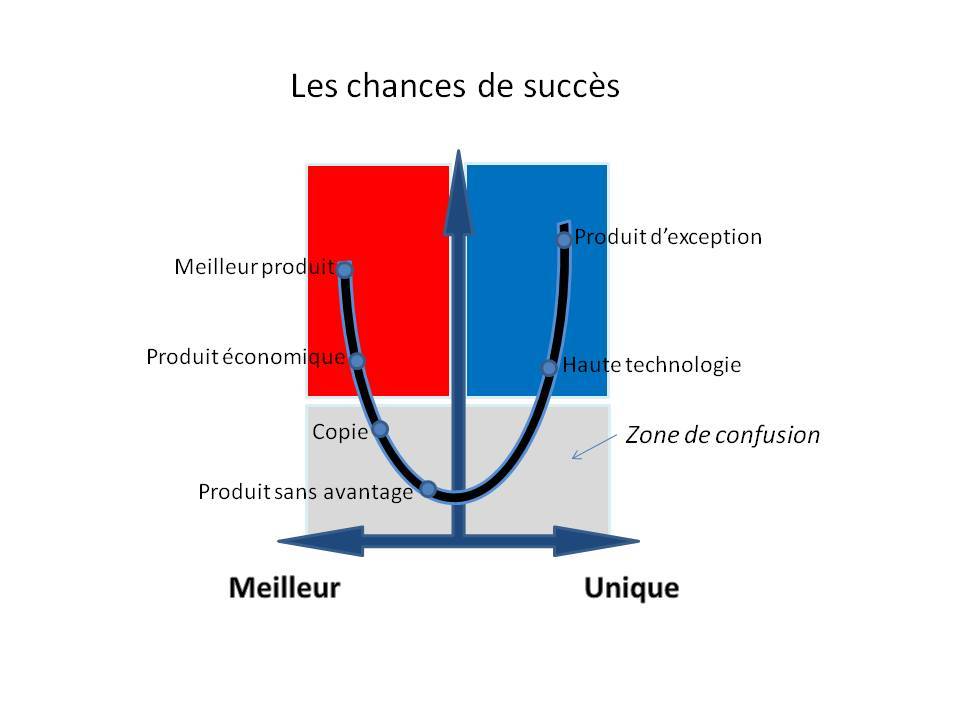 Les chances de succès d’un nouveau produit suivent une courbe en forme de U. Les deux extrêmes sont délimités par les deux façons d’innover, soit de proposer un meilleur produit ou encore un produit unique. Un meilleur produit a des caractéristiques supérieures à la concurrence. Tandis qu’un produit unique propose des caractéristiques non offertes par la concurrence. Plus la stratégie adoptée s’approche de la zone de confusion des clients (les clients confus n’achètent pas), plus grands sont les risques. Ainsi, selon les produits et les industries, les offres qui ne sont ni meilleures, ni différentes, ni plus économiques, ni plus réputées que la concurrence ont un taux de succès qui varient entre 10 % et 50 %.