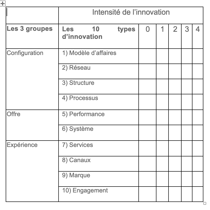 Les dix types d’innovation ont été développés par la firme Doblin en 1998 et démontrent que les compagnies qui intègrent plusieurs types d’innovation développeront une offre beaucoup plus difficile à copier et seront aptes à générer un plus grand retour. En plus de constituer un outil d’évaluation, l’exploration des types d’innovation facilite la génération d’opportunités d’affaires. Les dix types d’innovation sont regroupés en trois groupes, la configuration, l’offre et l’expérience.