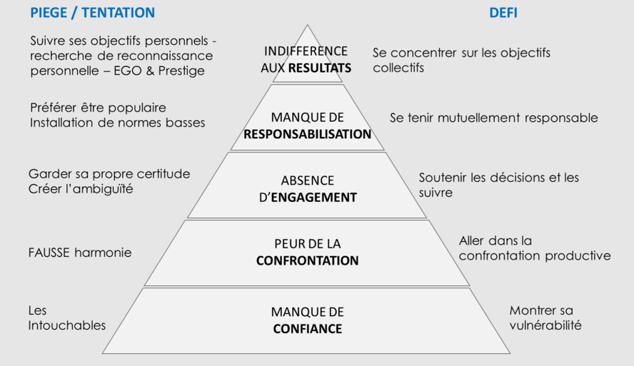 Enfin, il faut instaurer un climat permettant les débats d’idées et les saines discussions. Il faut que les meilleures solutions gagnent et non des débats «politically correct». La hiérarchie n’a pas sa place. Les idées sont les vedettes, et non les individus. Afin d’établir un tel climat, le dirigeant doit avoir confiance en lui. Il ne doit pas avoir peur de se faire challenger. Je vous conseille la lecture du livre «Les cinq dysfonctions d’une équipe» de Patrick Lencioni, en particulier le deuxième niveau de dysfonction.